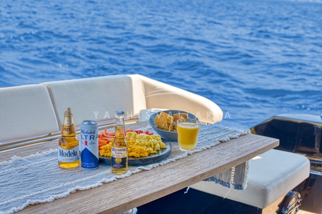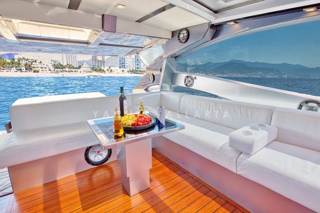 The large cockpit includes a sun lounger sofa, modular tables, and an electric awning,