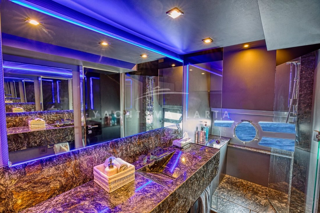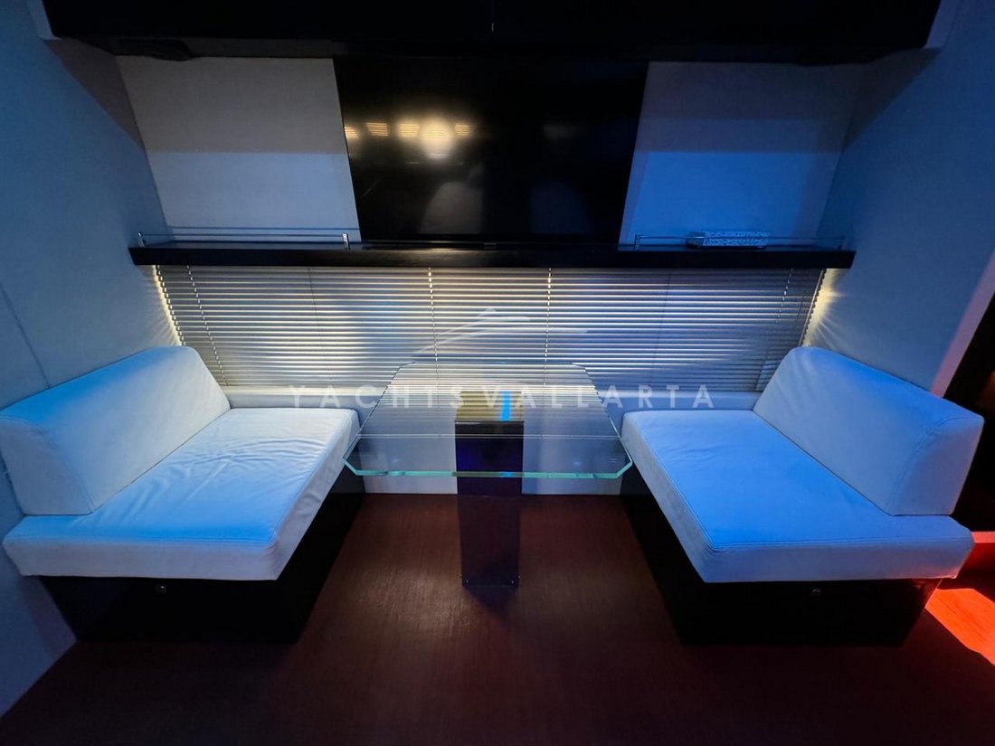 with a large sofa, retractable television, and dual helm stations—all crafted with