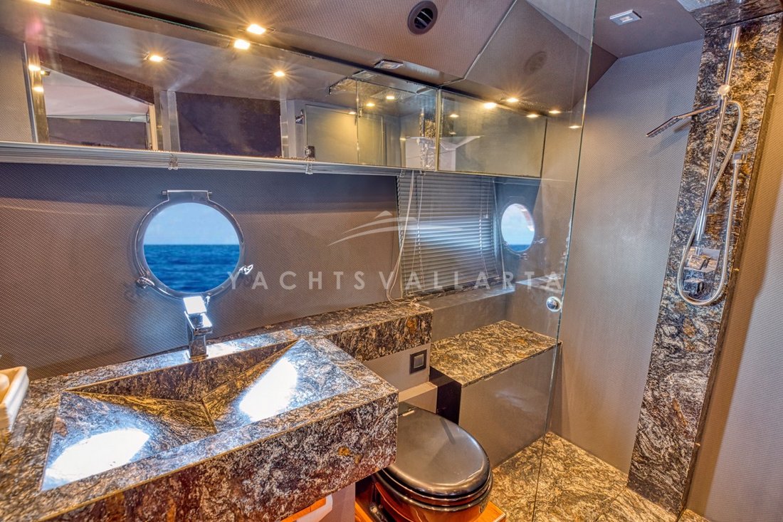 A distinctive glass door between the cockpit and the helm station—it allows the salon